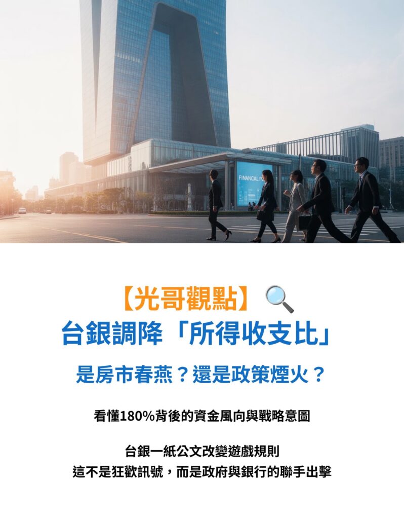 🧠 光哥觀點:台銀調降所得收支比,是「政策溫度計」也是「資金風向球」 發佈留言 / Blog, 基礎知識, 房地產, 推廣, 新聞點評 / greenmoonshisu 🔍 政策解析:180% vs. 200%,差在哪? 所得收支比200% → 180%:代表借款人只需較低的年收 […] 🧠 光哥觀點:台銀調降所得收支比,是「政策溫度計」也是「資金風向球」 閱讀全文 »